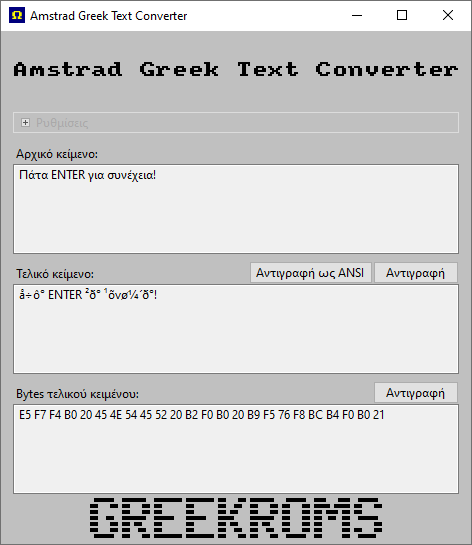 Amstrad Greek Text Converter converts Greek ASCII text to a custom Amstrad CPC Greek encoding by GreekRoms, in order to translate Amstrad CPC games in Greek!